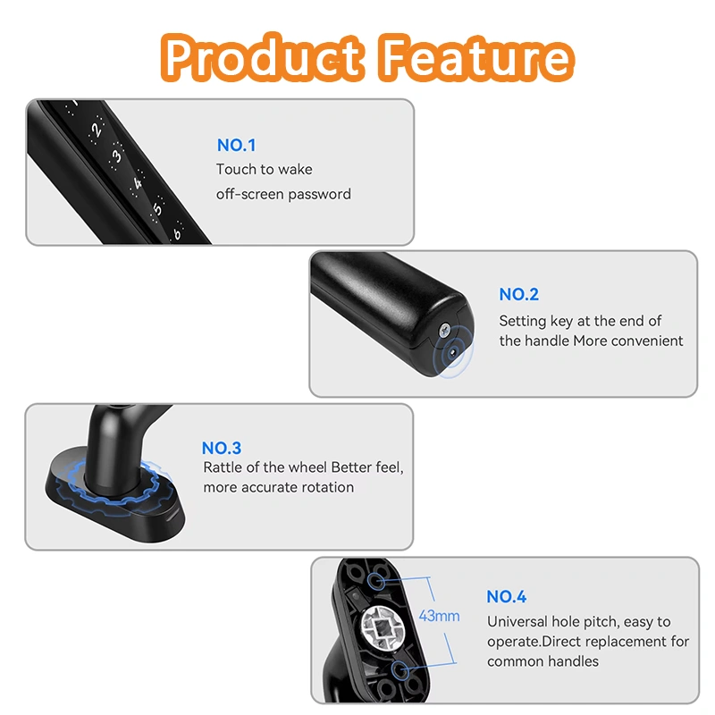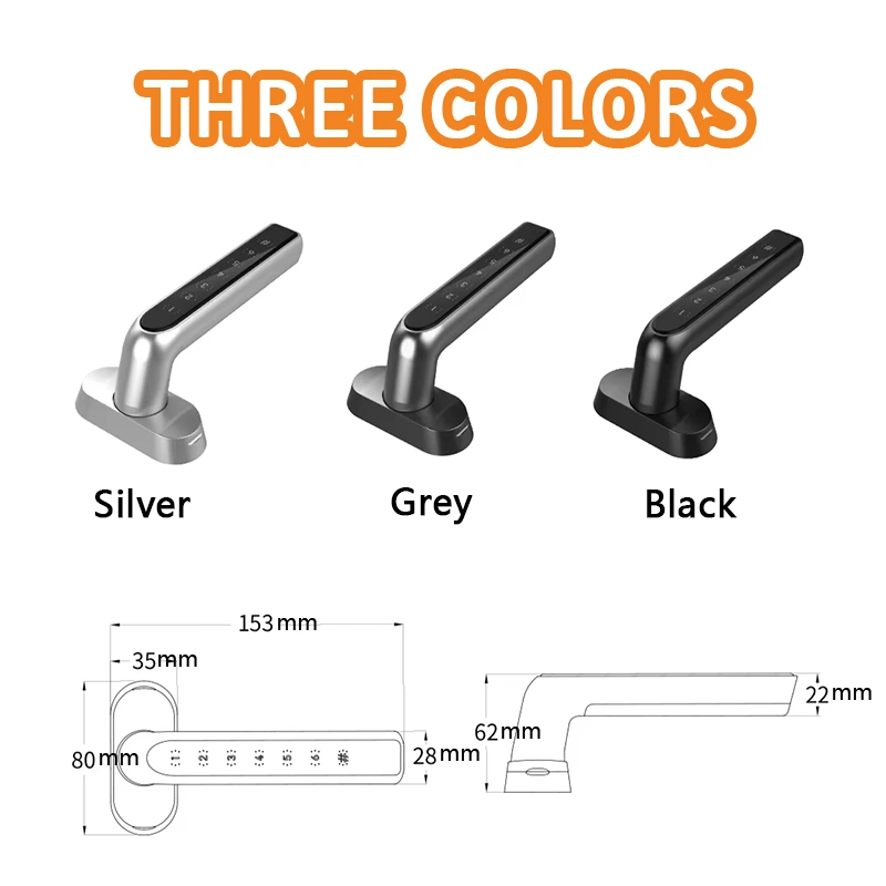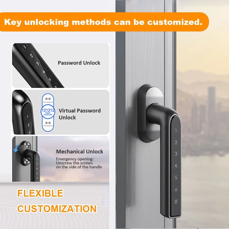 Unlocking methods: Password, Dummy Password, Emergency Access (unscrew the screws on the side of the handle)