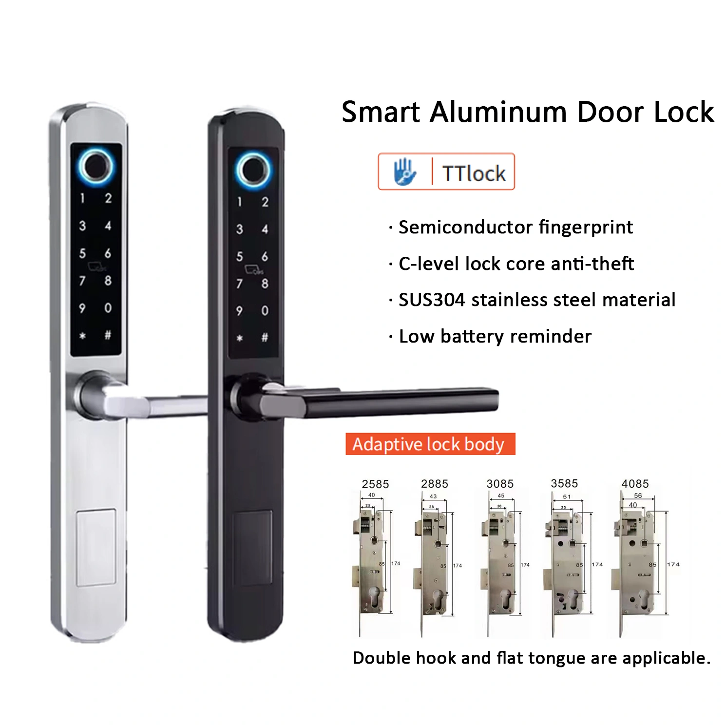 Unlocking methods: Fingerprint, Password, Card, Key, TT Lock App (optional).