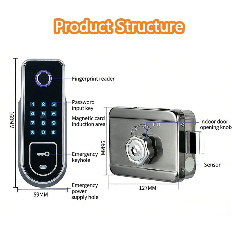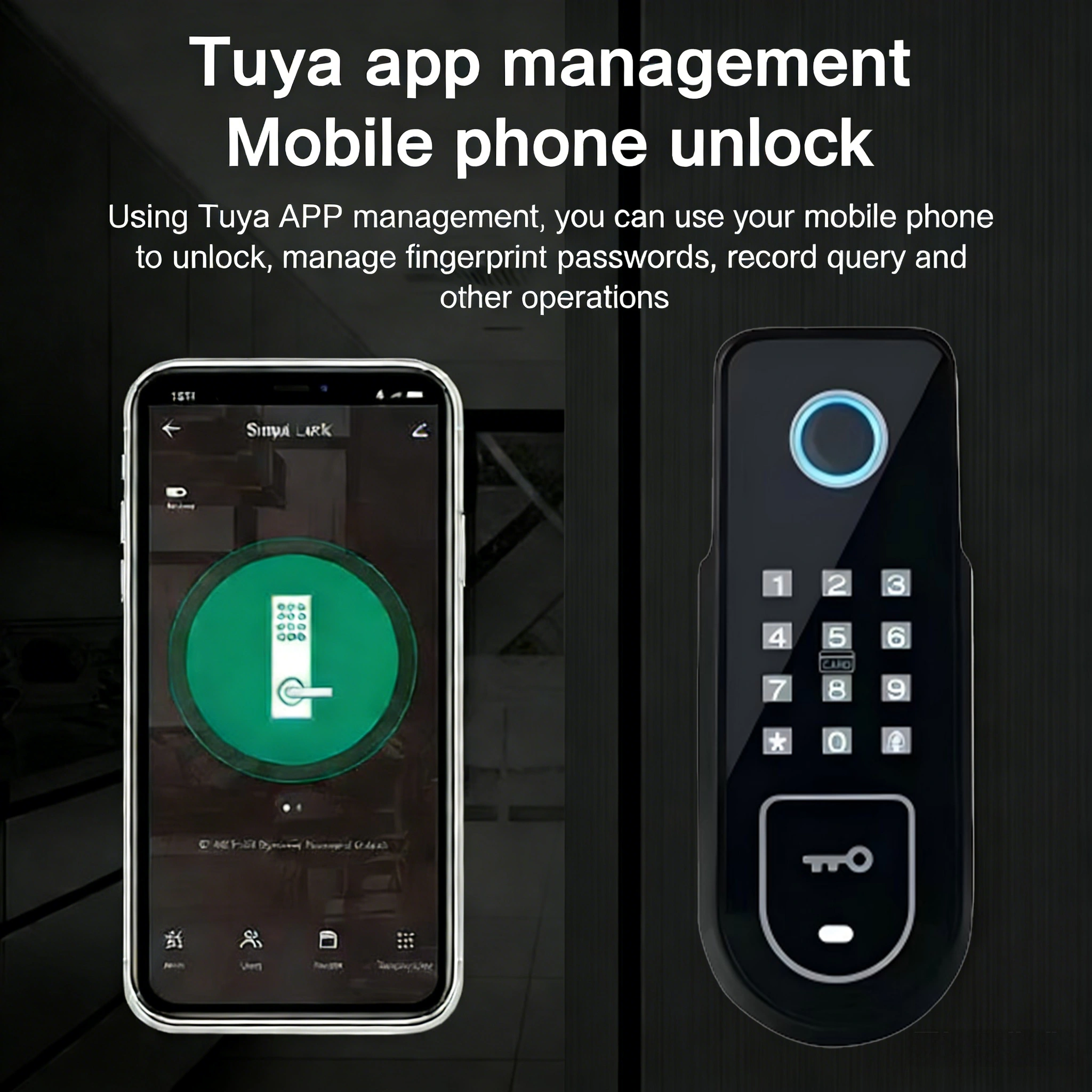 Unlocking methods: Fingerprint, Card, Key, Password, Tuya App. Supports temporary password and dummy password.