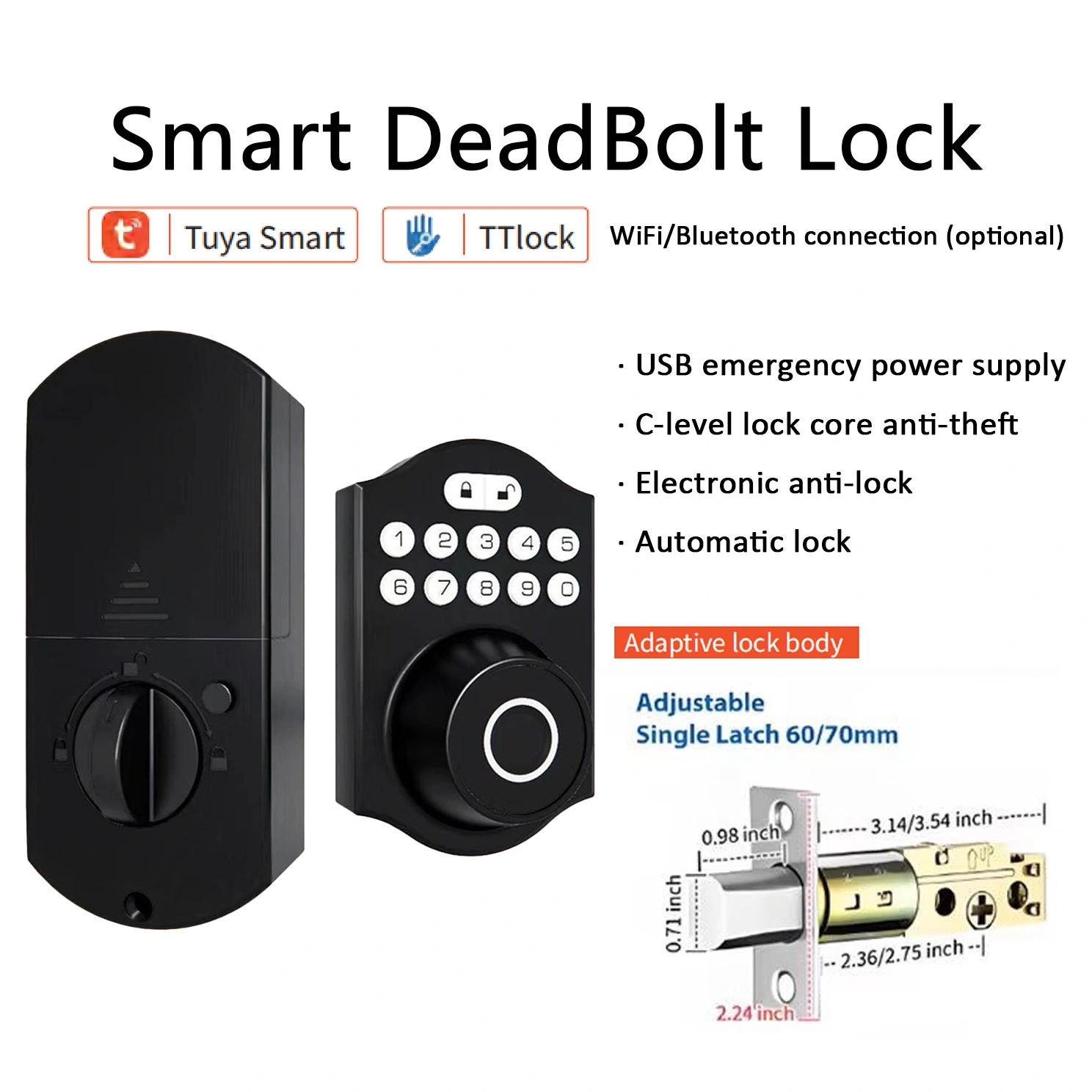 Unlocking methods: Password, Fingerprint, IC Card, Key, Tuya App/TT Lock App (optional: WiFi connection / Bluetooth connection).