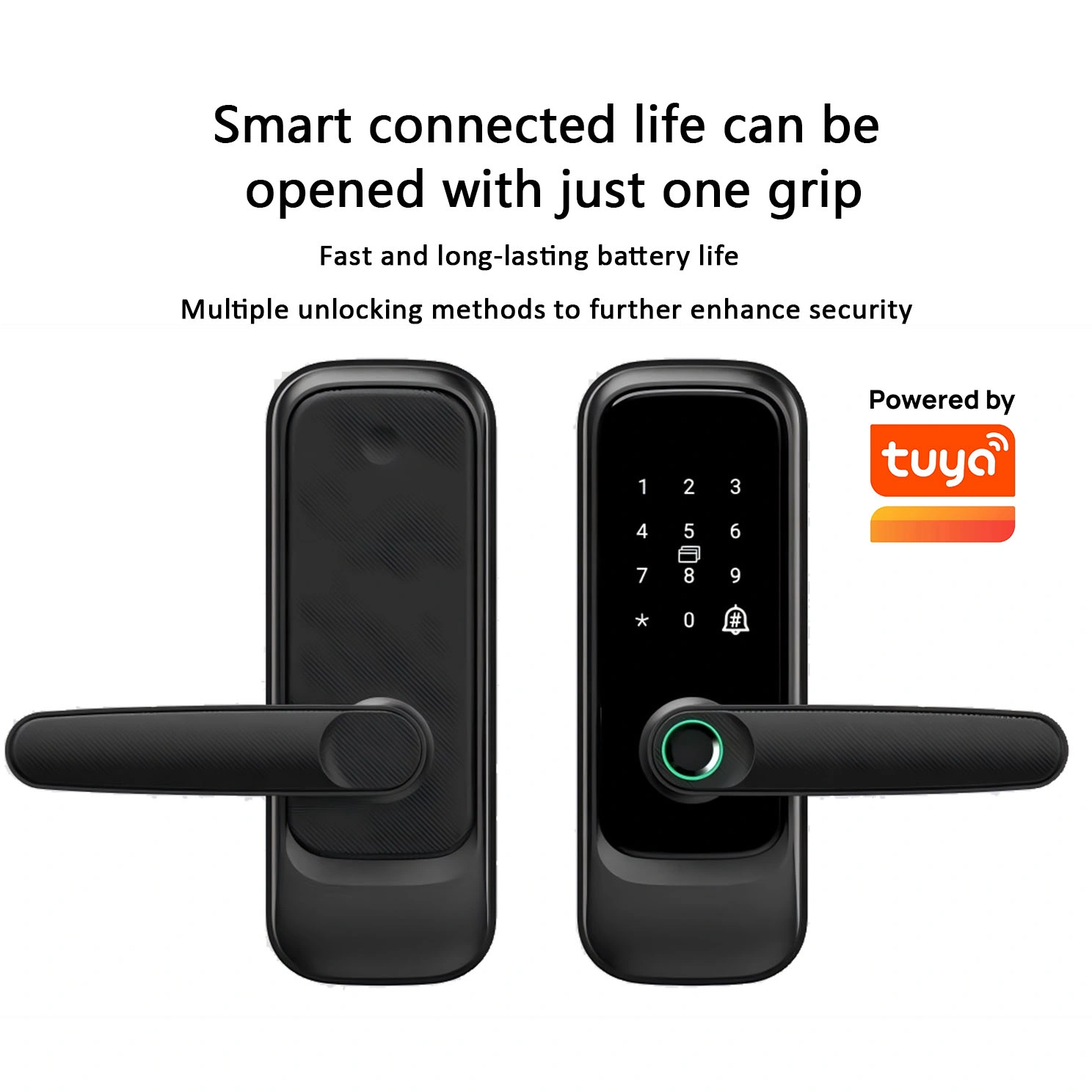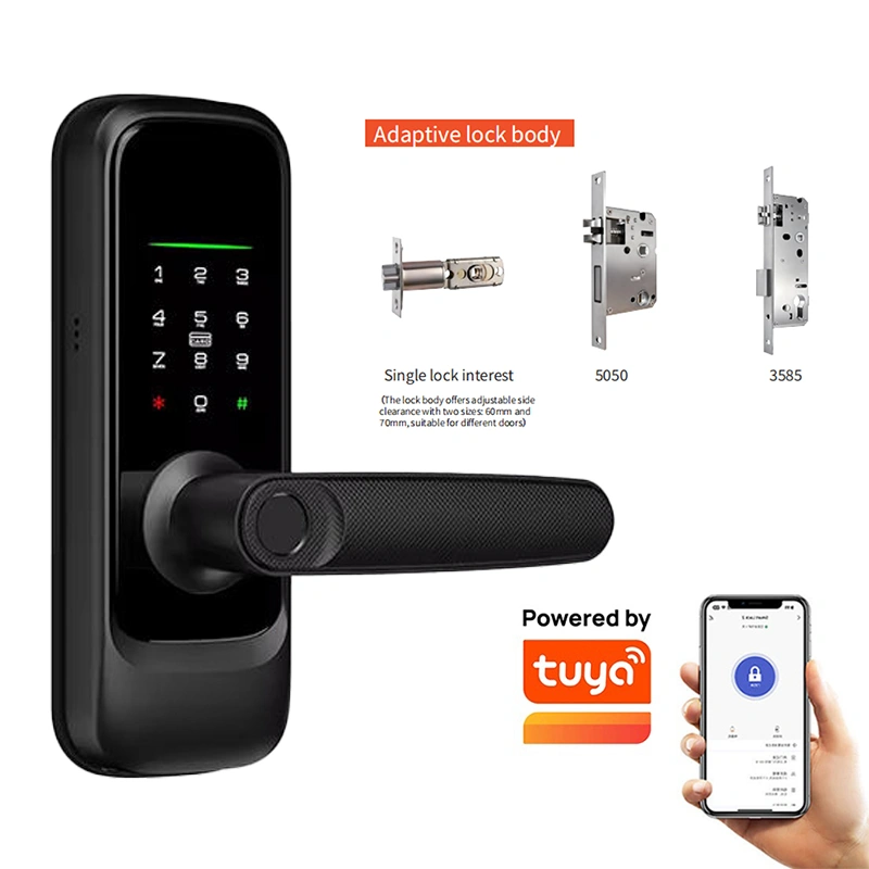 Unlocking methods: Password, Fingerprint, Magnetic Card, Key, Tuya App. Supports temporary password and dummy password.